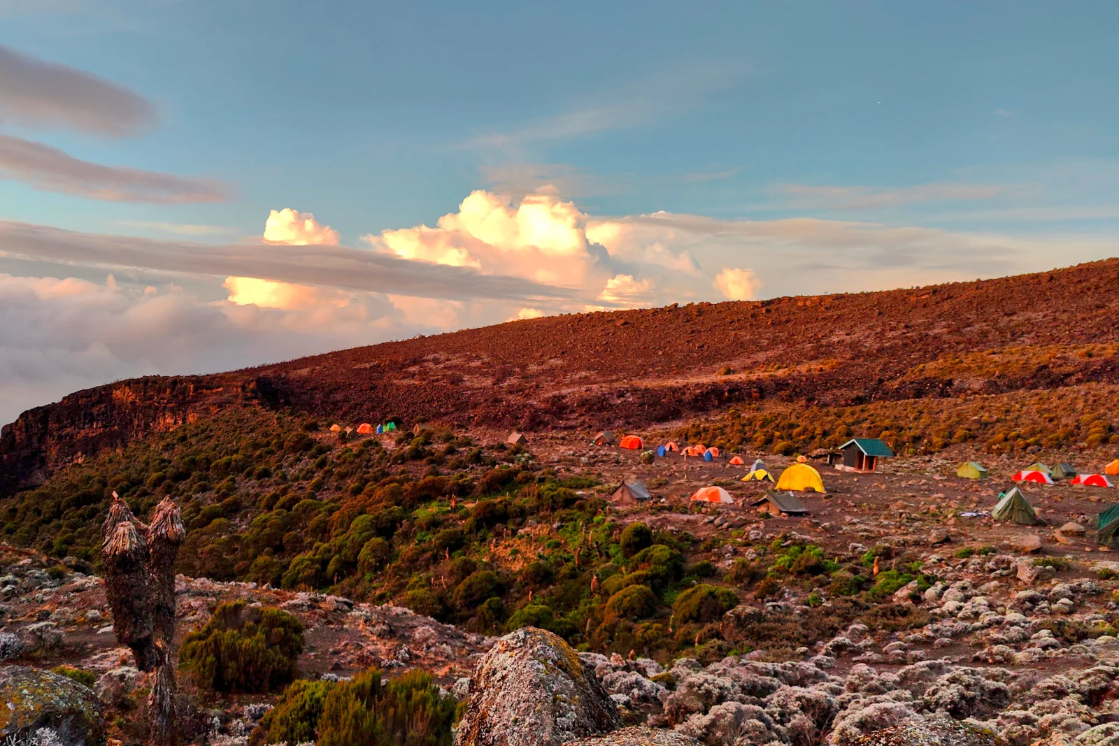 Perched at an altitude of around 16,000 ft (4,870 m), Kosovo Camp offers unobstructed, panoramic views of Kilimanjaro’s snowcapped summit and the vast plains stretching far below. Its elevated and more secluded setting provides a calmer atmosphere, ideal for rest and mental preparation before the summit push. Tents are pitched on rocky ground, exposed to the elements, yet the surrounding scenery is breathtaking—especially at sunset and under the star-filled night sky.