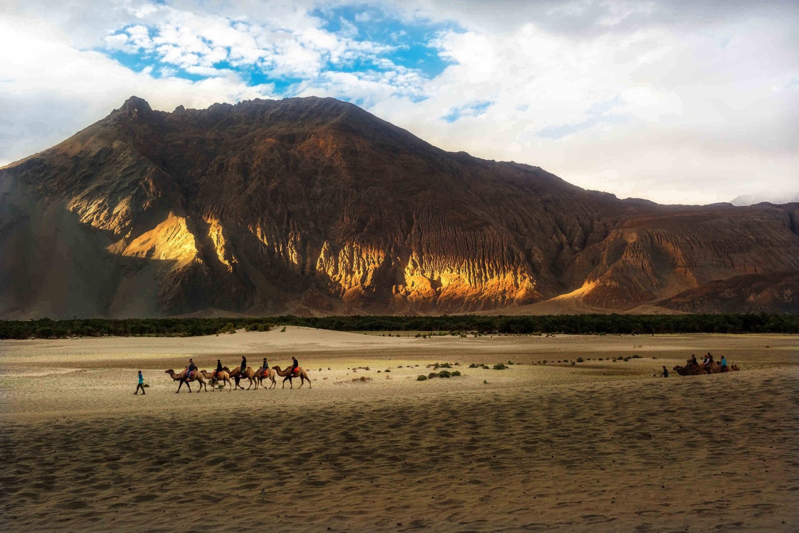 After breakfast, drive toward Nubra Valley via Khardung La, one of the world's highest motorable passes. From the top, enjoy breathtaking views of snow-covered peaks and endless mountain ridges. The sense of scale and altitude is unforgettable. Descend gradually into the Nubra Valley, where the landscape transforms into green oases fed by glacial rivers. Visit Diskit Monastery, home to the towering statue of Maitreya Buddha overlooking the valley. Later, explore the unique sand dunes near Hunder, where double-humped Bactrian camels roam against a Himalayan backdrop. The contrast of desert and mountains feels surreal.Transportation Private transfer (125 km, 7 hrs.)Max. Altitude 18,380 ft / 5,602 mAccommodation Premium HotelMeals included Breakfast, Lunch and Dinner -