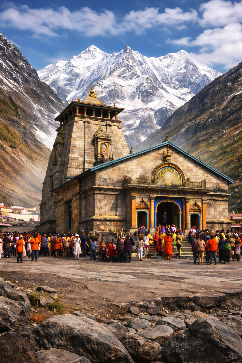 Nestled between the Nar and Narayan mountain ranges, Shri Badrinath stands at an altitude of over 3,100 meters, marking the place where Lord Vishnu meditated for the welfare of humanity, protected by Goddess Lakshmi in the form of a Badri tree. The surrounding region, home to Mana Village, Vyas Gufa, Bhim Pul, Charan Paduka, and the mystical origin of the Saraswati River; is steeped in timeless legends. Overnight stay at Shri Badrinath, immersed in divine stillness and grace.